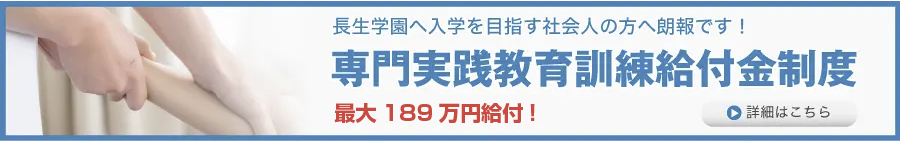 長生学園は、厚生労働省の「専門実践教育訓練給付金制度」の指定講座になっています。最大189万円が給付される制度です。 キャリアアップをお考えの対象者の方は、この機会にぜひご利用ください。