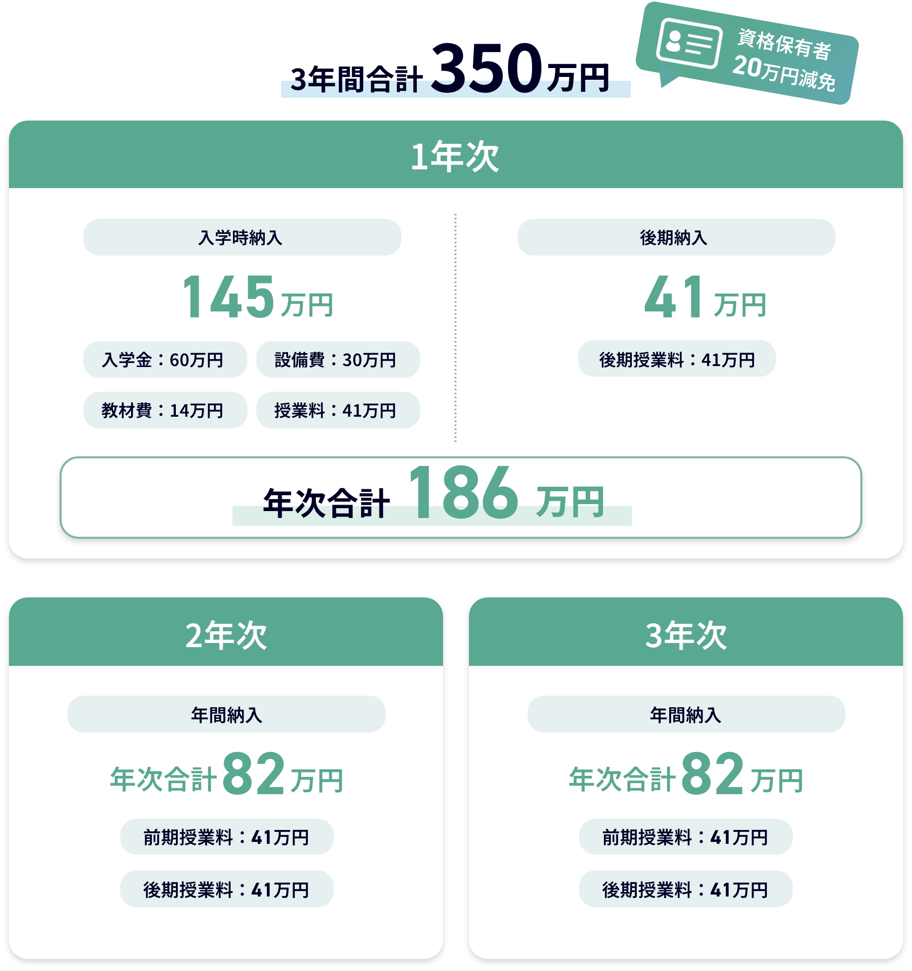 - ※別途教科書・白衣などの費用は3ヶ年分で約15万円となります。