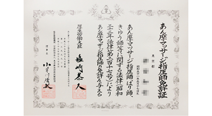あん摩マッサージ指圧師は「あん摩マッサージ指圧師、はり師、きゆう師等に関する法律」(昭和22年法律第217号)に基づき、厚生労働大臣より交付される国家資格のひとつです。